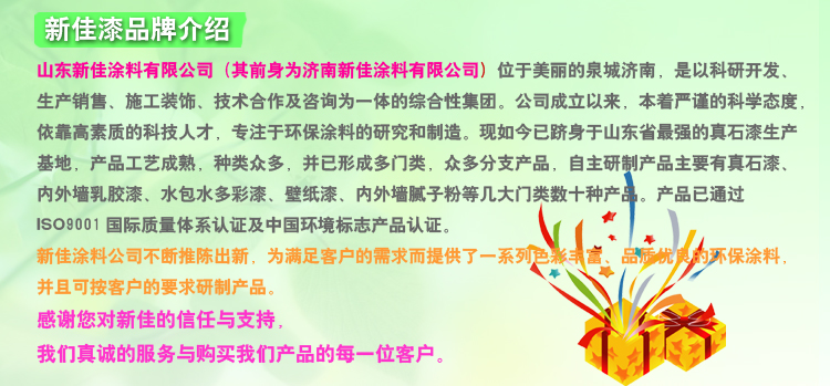 山东新佳涂料有限公司是专业的墙面漆生产厂家,夜光漆系列产品生产线遵照国际领先的生产工艺加工,产品具有发光亮度高、产品附着力强、涂刷面积大、净味无毒等优良特性,新佳公司通过 ISO 9001 国际质量管理体系认证,产品通过了中国绿色产品国际认证,产品经过多家国内权威部门检测,质量可靠,让您放心!