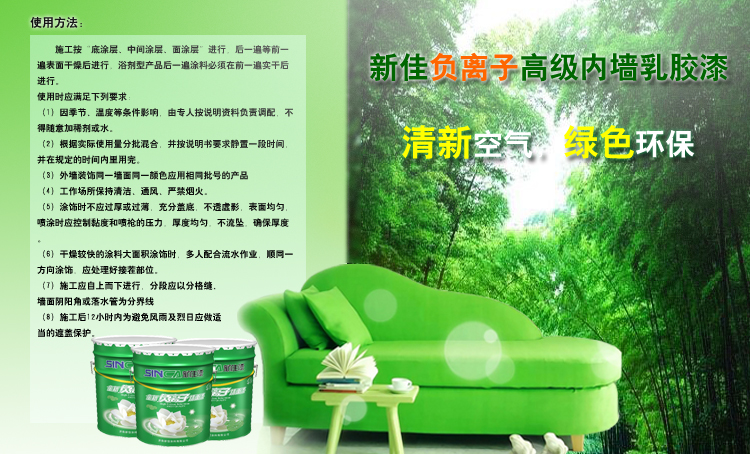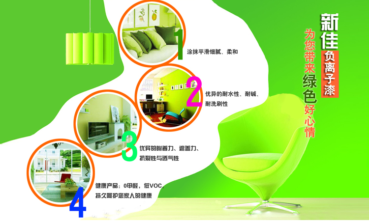 本产品不仅具备内墙乳胶漆的全部功能,更重要的是可长久释放负离子。采用不含APEO的乳液和优质助剂及负离子添加剂经精细研制而成,能有效吸收和分解空气中的有害气体,持久释放负离子,净化室内空气。耐擦洗性超强,高档,哑光。乳胶漆中含有不规则的负离子矿物晶体,涂刷后能持续释放负离子,从而有效降低室内空气中的甲醛、VOC和粉尘含量,中和有害气体和微粒(正电荷),灭杀和抑制细菌、病毒,达到抗菌、抑菌、防霉、消除异味,全面持久地净化室内空气。有效释放负离子,促进人体新陈代谢,对人体具有保健效果,让自己在家里也能体会到如同在健身房里的健康状态。对人体达到细胞活性化、净化血液、快速恢复疲劳、放松心情,提高免疫力,所以负离子在医学界被称为是“空气维生素”。在您的生活环境中营造森林雨瀑般的清新空气,远离空气污染困扰,长久呵护您和您家人的健康。