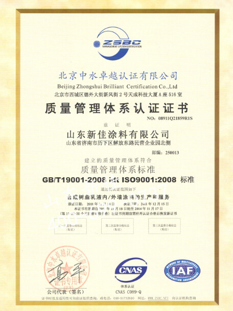 新佳涂料资质荣誉:20年口碑企业成为建筑商金牌合作商家天然真石漆现己全面通过ISO9001:2000国际质量管理体系认证ISO14001国际环境管理体系认证首批荣获中国环保产品认证中国涂料中小企业联合常务理事单位。