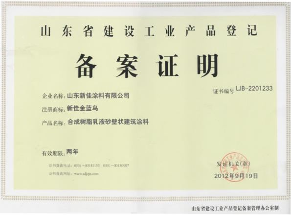 当前位置:首页 » 资质认证 » 山东省建设工业品备案证 真石漆系列