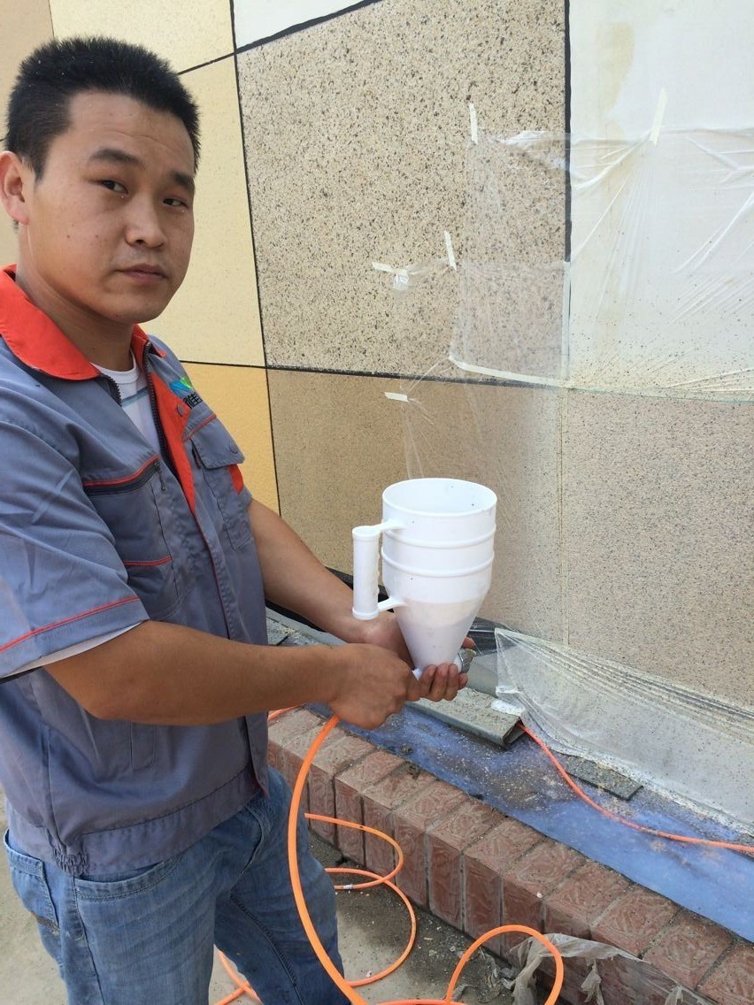 真石漆项目中,产生发花现象较为普遍,导致工程发花的原因主要有两方面:首先是施工不规范,操作工人技术欠缺,因喷涂不均匀造成涂层表面质感不一致形成接茬;其次因主材成膜物质与罩面乳液档次问题造成耐污性差,一段时间后,空气中的灰尘、雾霾等污物积聚在外涂层表面,在厚薄不均与接茬等部位形成非常明显的发花现象。