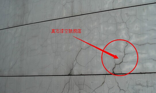 真石漆空鼓脱落?主要原因有:真石漆施工时基层处理不平整,含水率过大;水泥砂浆、混凝土基层因龄期不够,或因养护温度过低而强度不够,混合砂浆基层设计强度偏低,或者施工时配比不正确;真石漆的质量不合格;没有使用抗碱封闭底漆;主涂面还没有完全干燥即涂装罩面清漆等。如图: